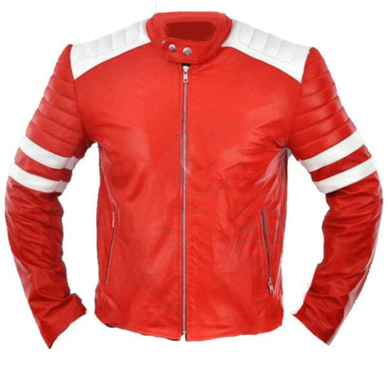 Red moto style jacket with white patches