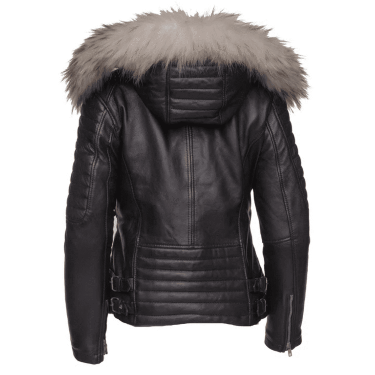 Larissa’s Black Leather Jacket with Hoodie and Fur Trim
