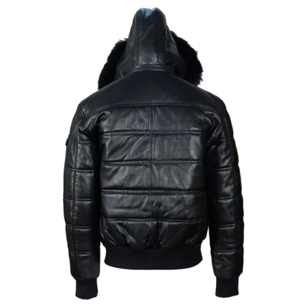 Joel quilted puffer winter leather jacket with diamond stitching and fur hoodie