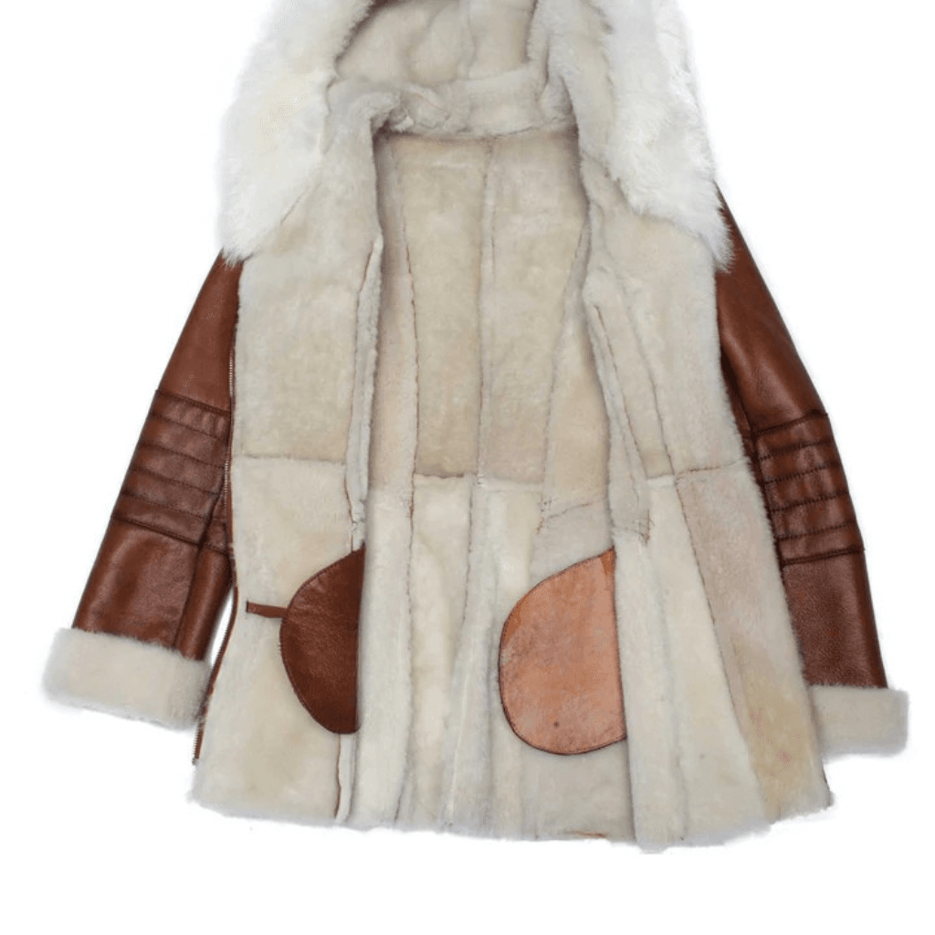 The stylish Ayva’s Tan Shearling coat with fox fur trim Hoodie is what you should totally go for this winter season. This shearling coat has a very sophisticated and sleek appearance. The exterior of this coat is manufactured with 100% fine Spanish merino double-faced sheepskin shearling. On the internal side, 100% sheepskin shearling is attached. Ayva’s Tan Shearling coat has a branded zipper attached to its front side for closure. The coat comes with a stylish collar with a hoodie with real fox fur trim to intensify the look. Moreover, it has two functional outside pockets to secure stuff. The open fur cuffs look quite cool on this shearling coat.