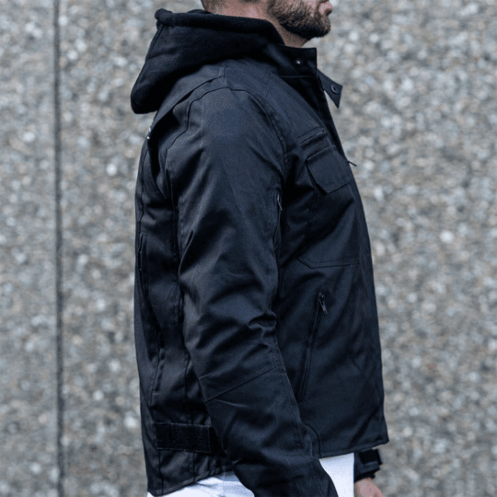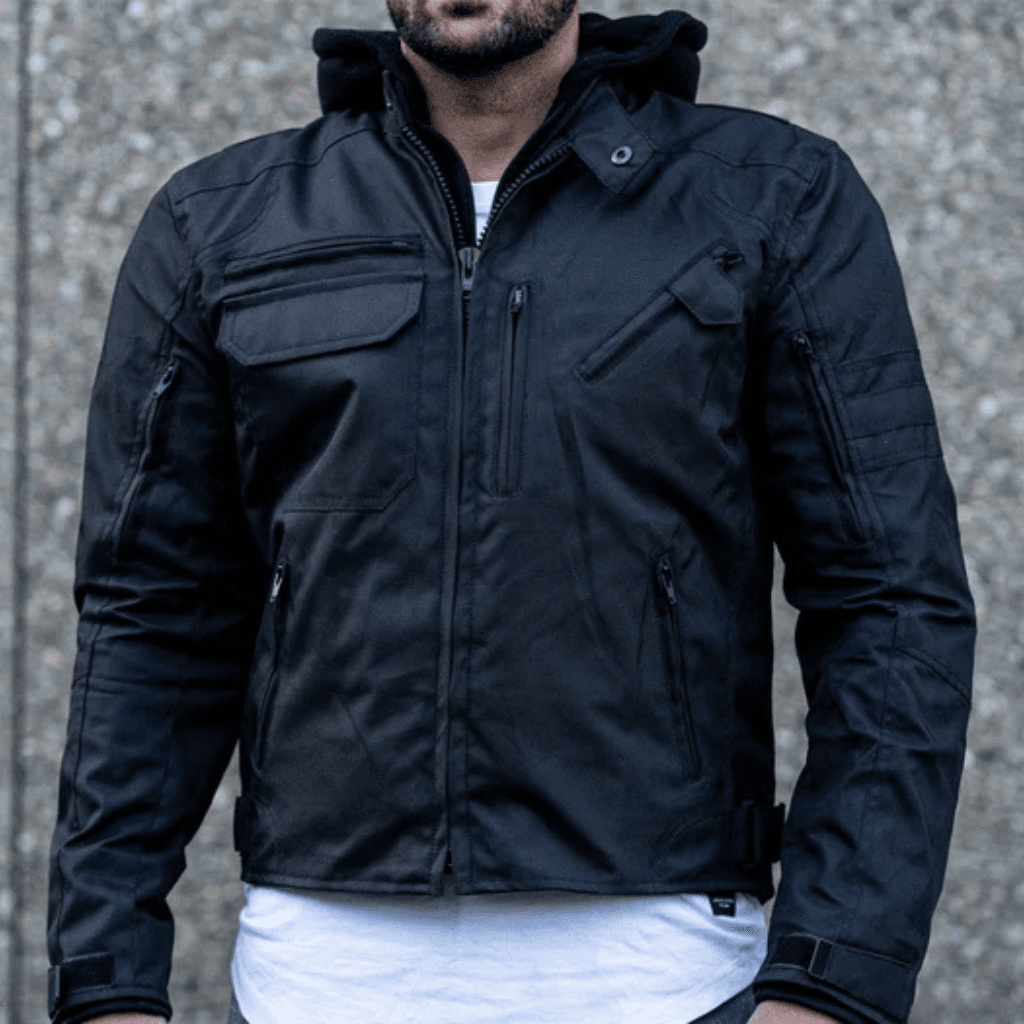 “Black Utility” Air Ventilation and Hooded Breathable and Waterproof Textile Motorcycle Jacket with armor protectors