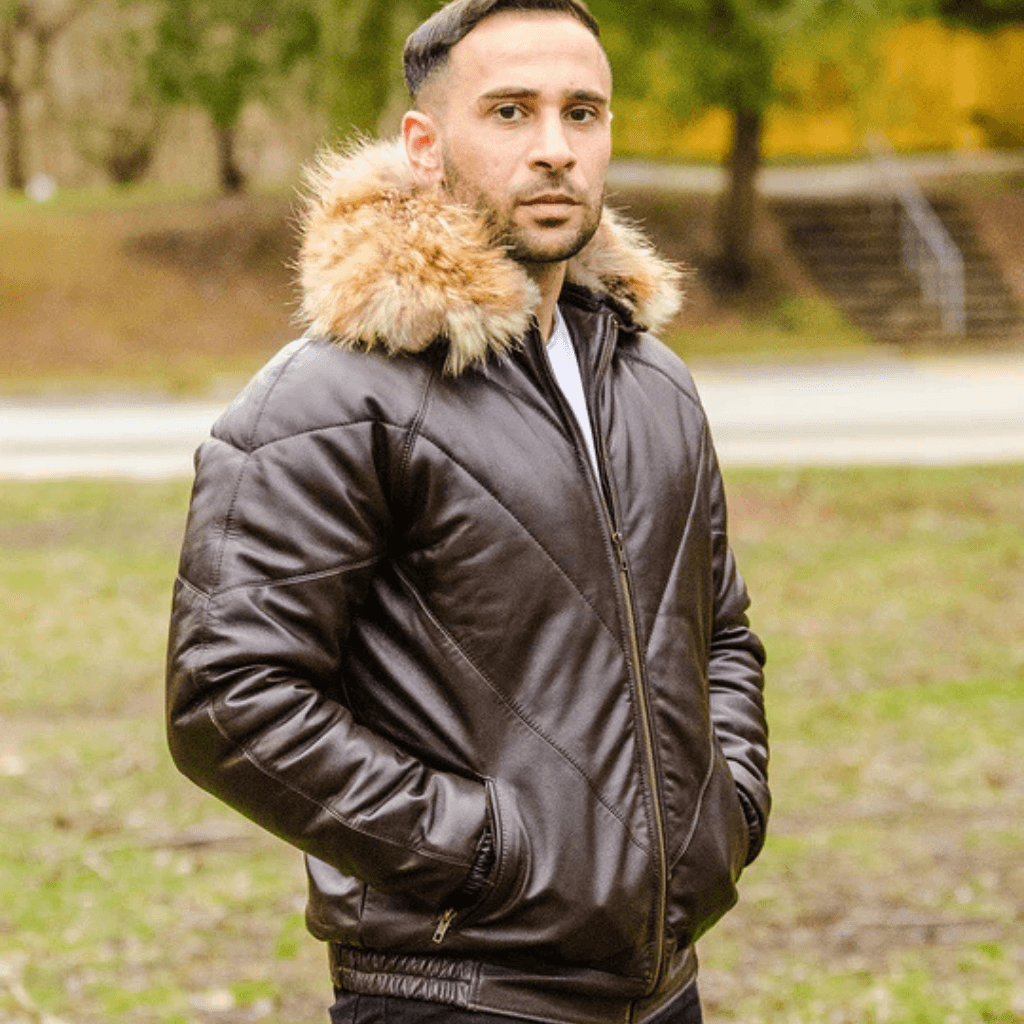 Be the first to review “Brown V-Bomber style Puffer Winter Leather Jacket with fur collar” Cancel reply