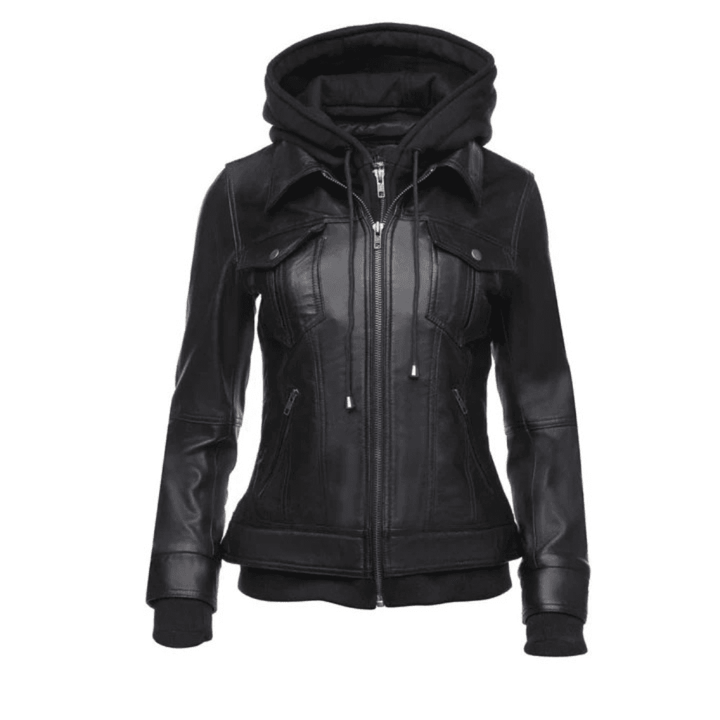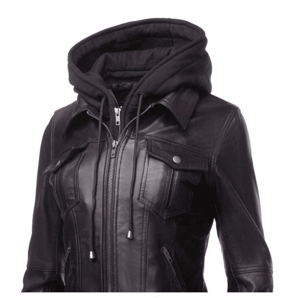 Daphne Black Leather Jacket With Fleece Hoodie