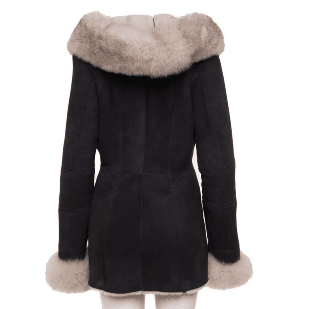 Pheobe’s Grey Hooded Suede Shearling Jacket with fox fur