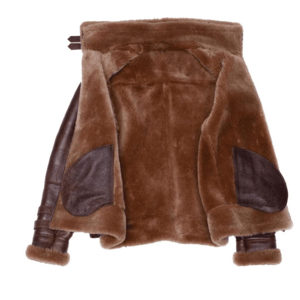 Phan’s Brown Aviator bomber shearling jacket with a waist belt