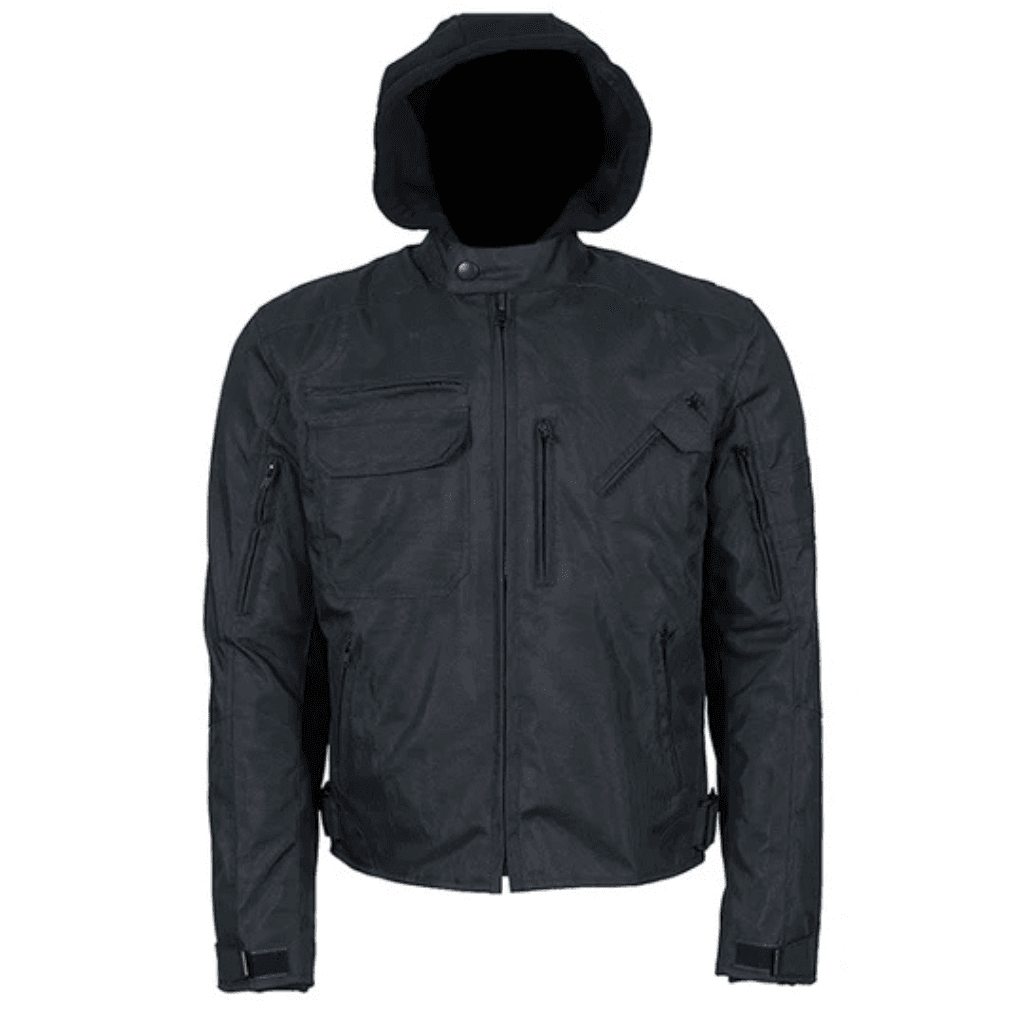 “Black Utility” Air Ventilation and Hooded Breathable and Waterproof Textile Motorcycle Jacket with armor protectors