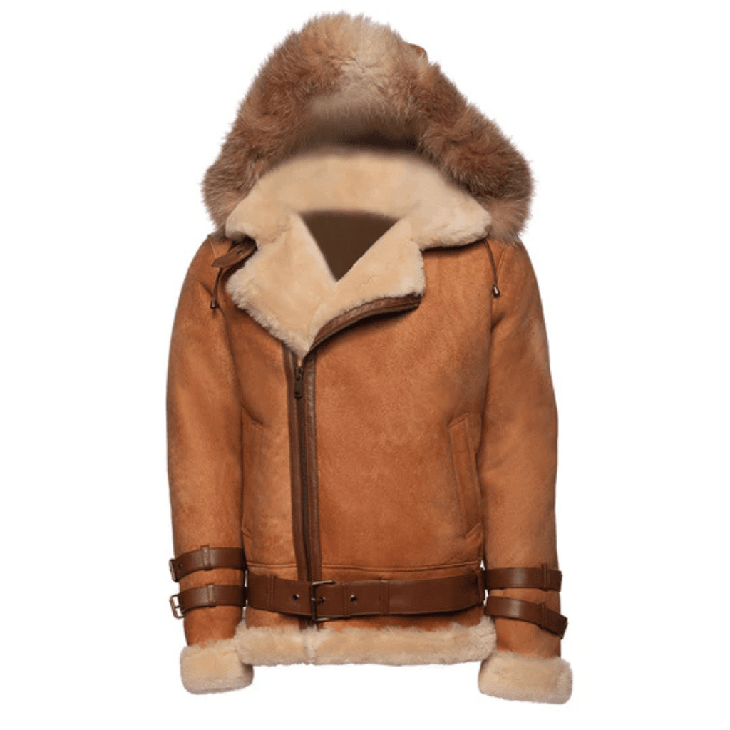 Be the first to review “Rocco Vintage Cognac Aviator bomber shearling jacket with Fox trim hoodie” Cancel reply