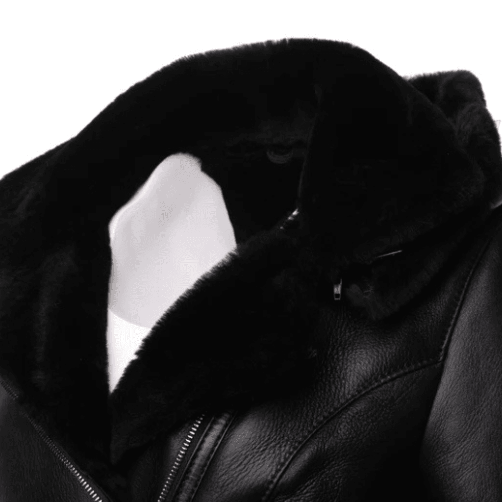 Sofie’s black biker style sheepskin shearling jacket with hoodie