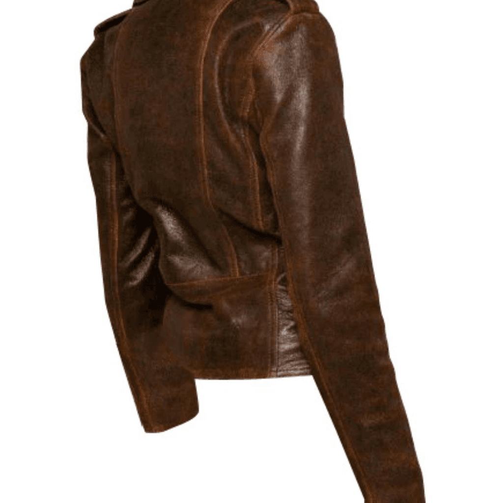 Tracy’s shaded brown crop biker leather jacket with waist belt