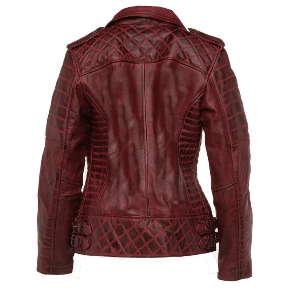 Marissa’s Antique red diamond quilted leather jacket with double zipper